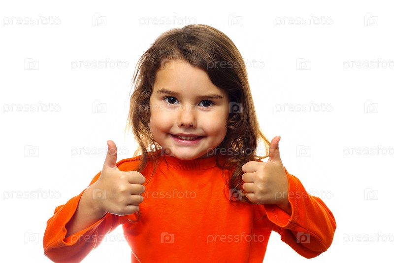 Маленькая девочка брюнетка в оранжевом жакете показывает два больших пальца вверх, изолировано на белом фоне
