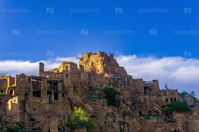 Вечерний вид на заброшенное село (аул) Гамсутль на вершине горы в Дагестане