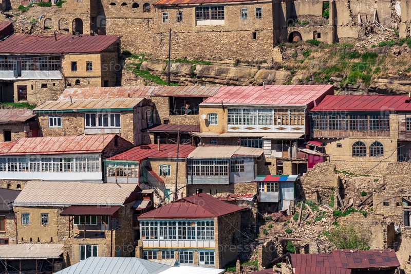 Фасады домов, расположенных ярусно на крутом склоне в селе Чох в Дагестане