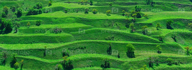Горный пейзаж с зелеными террасными сенокосами на склонах