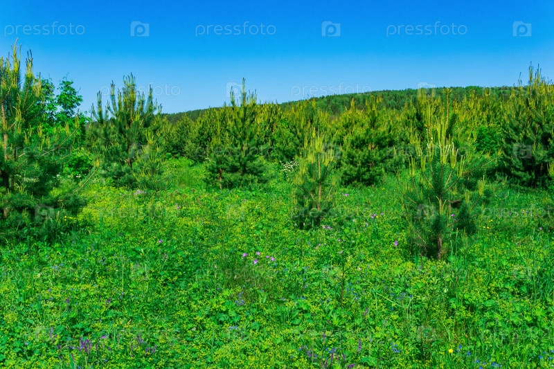 Пейзаж с переходным лугом с молодой порослью елей