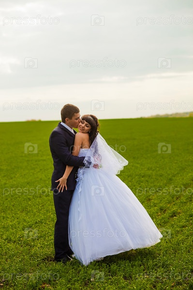 Русские невеста и жених стоят в поле, взявшись за руки на фоне голубого неба