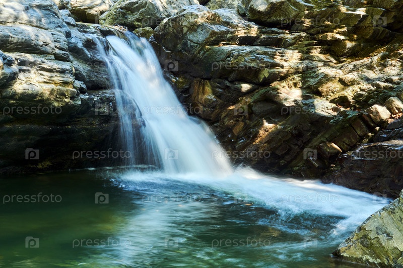 Небольшой горный водопад среди скал, вода размыта в движении