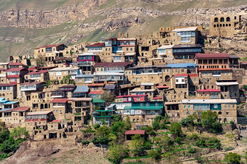 Фасады домов, расположенных ярусно на крутом склоне в селе Чох в Дагестане