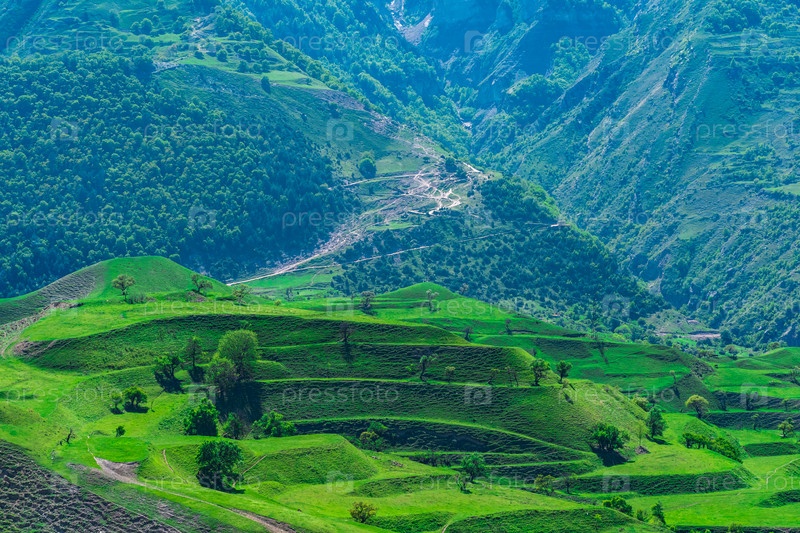 Горный пейзаж с зелеными террасными сенокосами на склонах