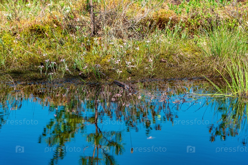 Болотный пейзаж с кочками травы и отражением в открытой воде