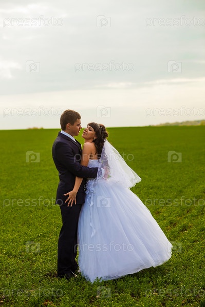 Русские невеста и жених стоят в поле, взявшись за руки на фоне голубого неба