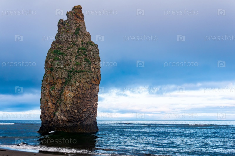 Морской пейзаж Кунашира, берег океана с огромной вертикальной скалой в воде и дикий пляж с водорослями, выброшенными морем