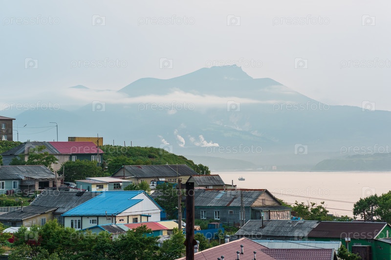 Пейзаж города Южно-Курильска на острове Кунашир с видом на морской залив и вулкан Менделеева вдалеке