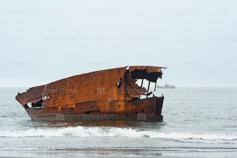 Ржавое кораблекрушение на фоне туманного морского пейзажа с кораблем вдалеке