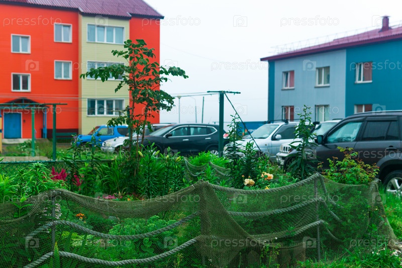 Ландшафтный дизайн в приморском поселке, клумба огорожена старой рыболовной сетью