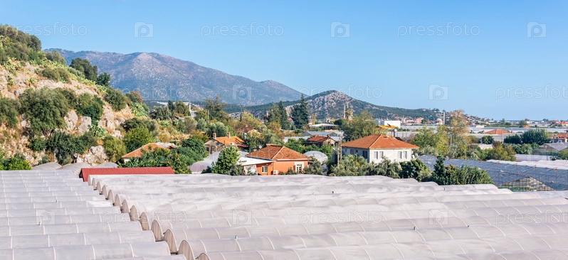 Вид на город Демре на юге Турции с сельскохозяйственными политоннелями среди гор