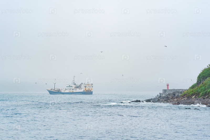 Рыболовное судно выходит из-за мыса с маяком и плывет в туманное море