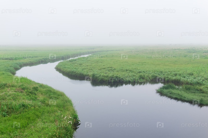 Утренний пейзаж, обширный луг с сочной травой скрыт туманом