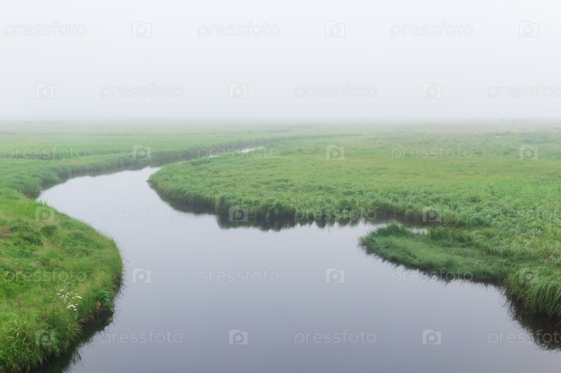 Утренний пейзаж, болотистый луг с сочной травой вдоль берега реки скрыт туманом