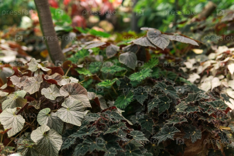 Частично размытый естественный фон с листьями бегоний, растущими в подлеске