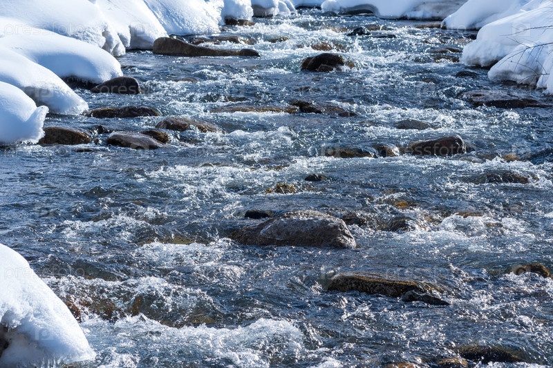 Весенний ручей в горной реке среди заснеженных берегов, пейзаж, фон