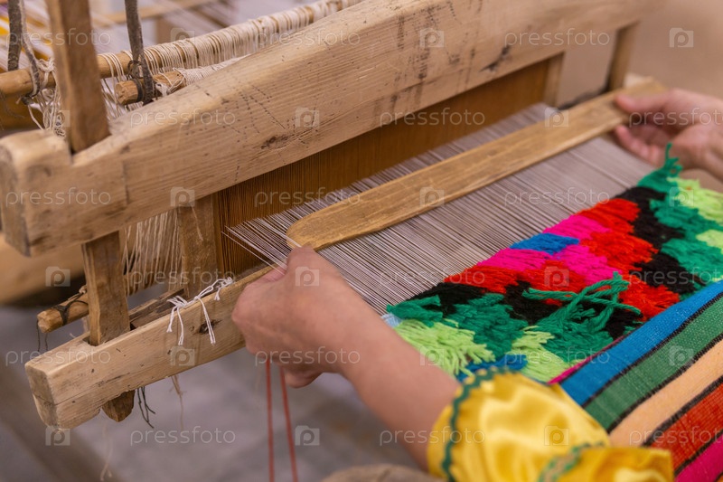 Процесс плетения гобелена на традиционном деревянном ткацком станке
