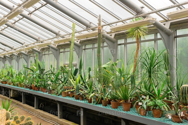 Коллекция суккулентов и кактусов на полке теплицы