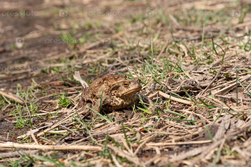 Пара обыкновенных жаб в амплексусе среди сухой травы