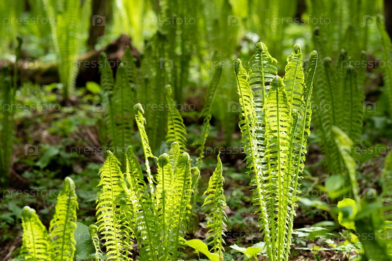 Естественный весенний фон, лесной пейзаж с саженцами папоротников