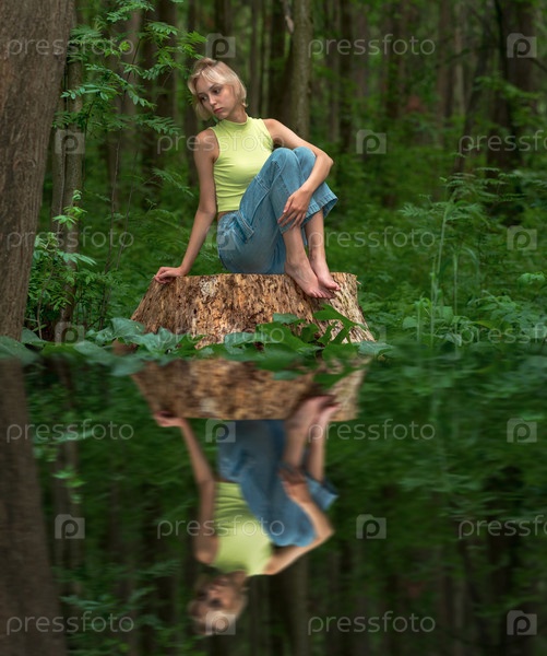 Девочка-подросток сидит на пне в естественном лесопарке с грустным и задумчивым взглядом, отраженным в воде