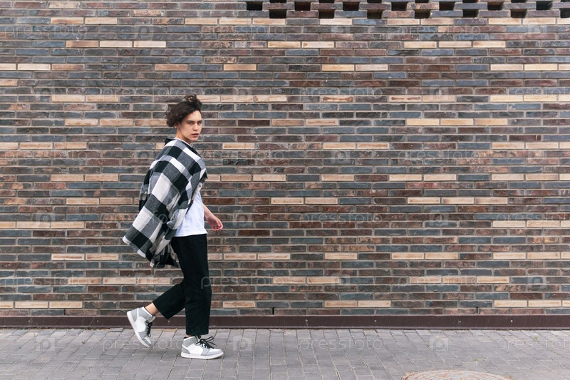 Молодой человек идет по улице перед кирпичной стеной