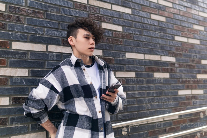 Молодой человек с телефоном у кирпичной стены