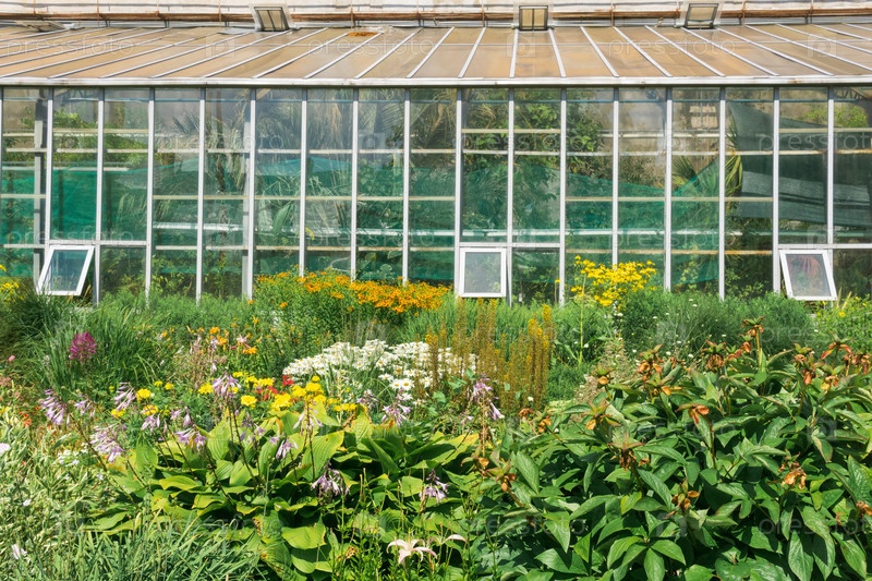 Цветник на фоне тропической оранжереи
