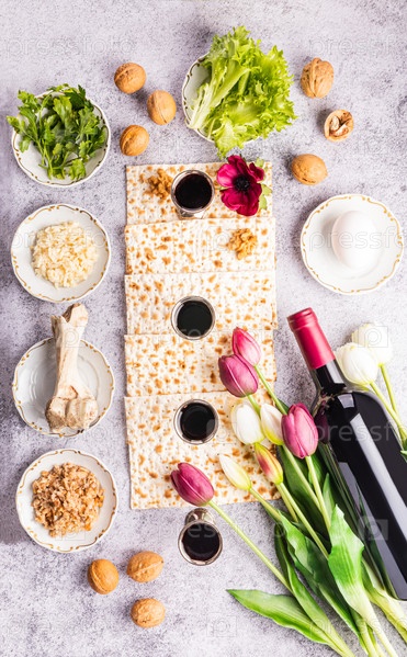 Плоская раскладка традиционных продуктов для еврейского праздника Пасхи. Вино, маца, петрушка, салат, яйцо, кость. Вертикальный вид сверху
