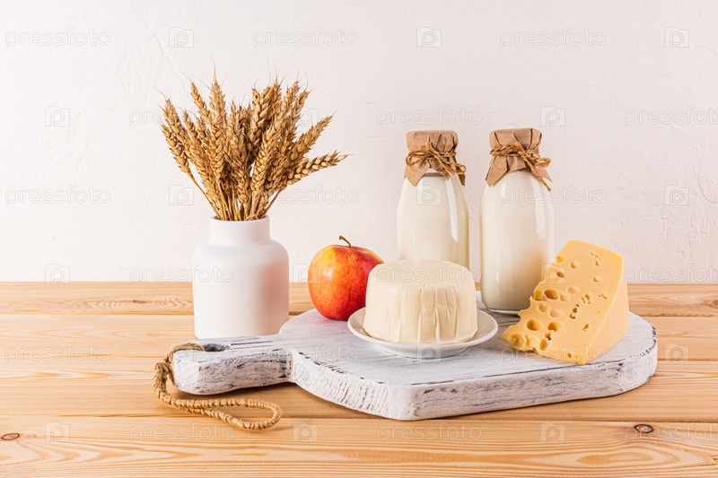 Свежие молочные продукты, сыр, молоко, яблоки и колосья в вазе к празднику еврейского Шавуота. Передний план