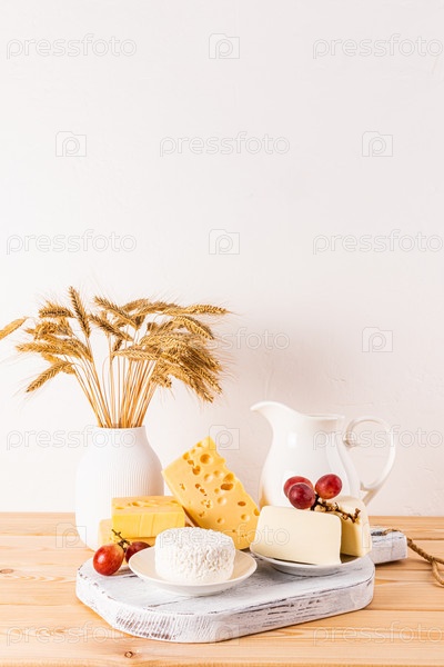 Красивый натюрморт к празднику еврейский Шавуот. Свежие молочные продукты, виноград и колосья хлеба на белом вертикальном фоне