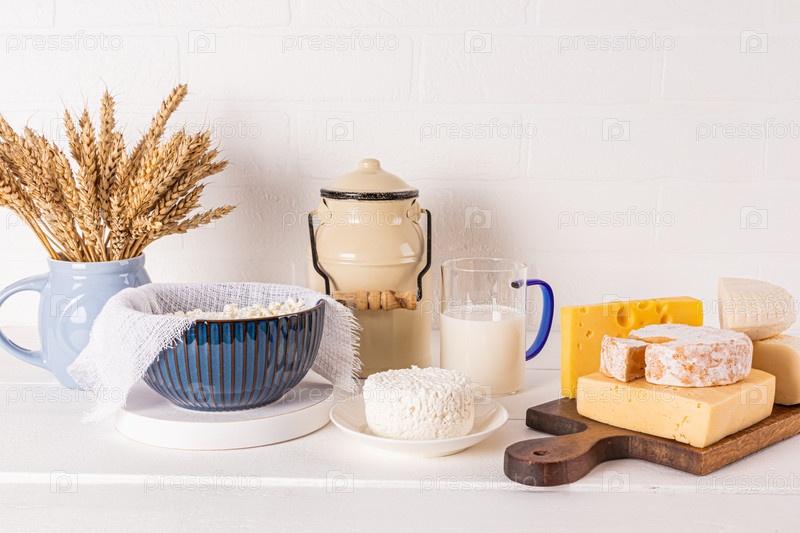 Банка с молоком, миска со свежим творогом и сыром на деревянной доске и белом фоне. Традиционные молочные продукты на Шавуот