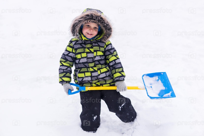 Маленький мальчик играет зимой в снегу