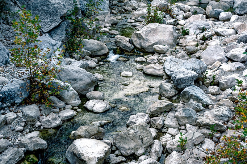 Лесистый горный каньон с ручьем в скалистой постели, вид сверху
