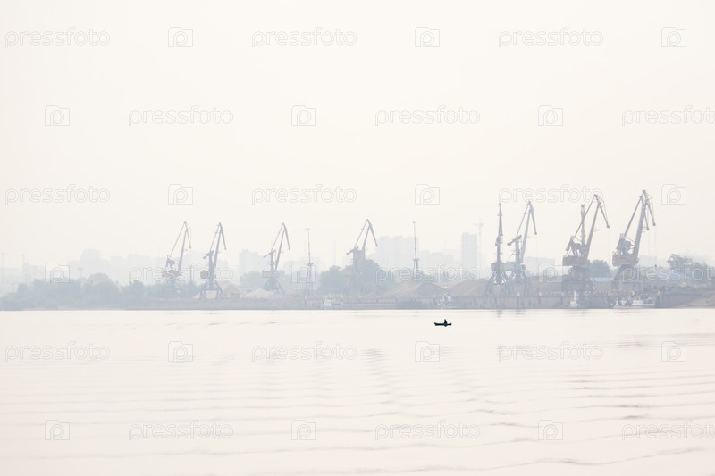 Индустриальный пейзаж речного грузового порта, скрывающегося в утренней дымке