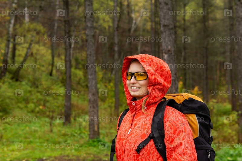 Улыбающаяся путешественница в осеннем лесу