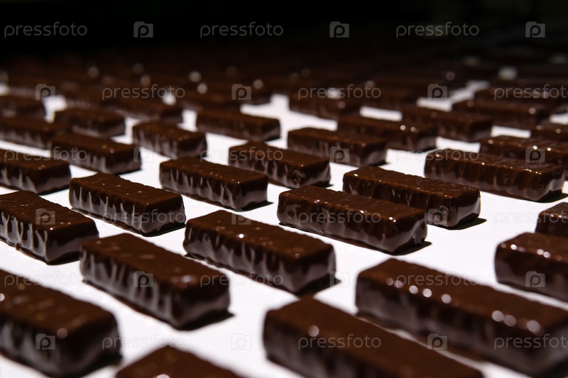 Шоколадные конфеты на конвейере кондитерской фабрики крупным планом