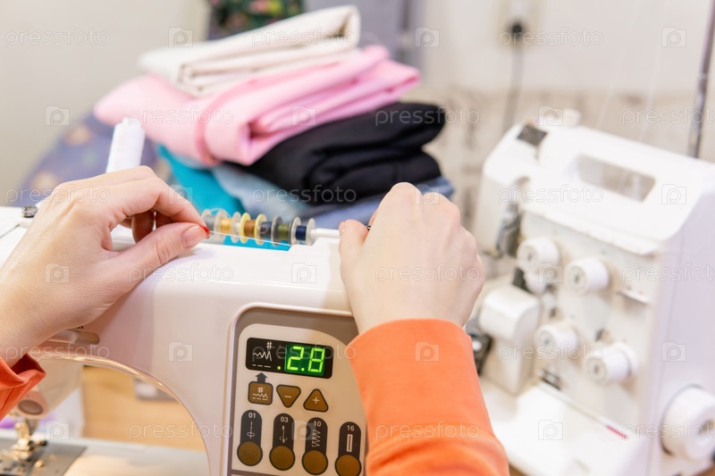 Швея перематывает нитки с катушки на шпульку, крупный план