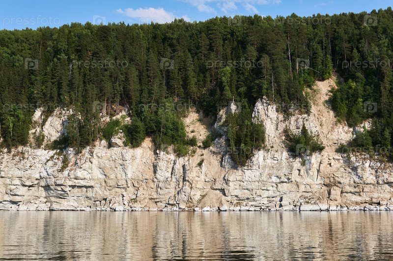Обрывистый берег Камского водохранилища, меловые береговые скалы, поросшие лесом