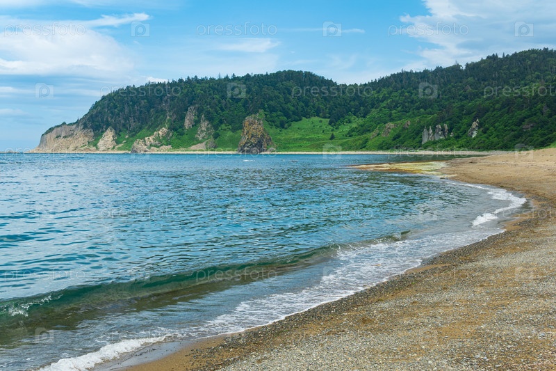 Прибрежный пейзаж, галечный пляж и красивые лесистые скалы на зеленом побережье острова Кунашир