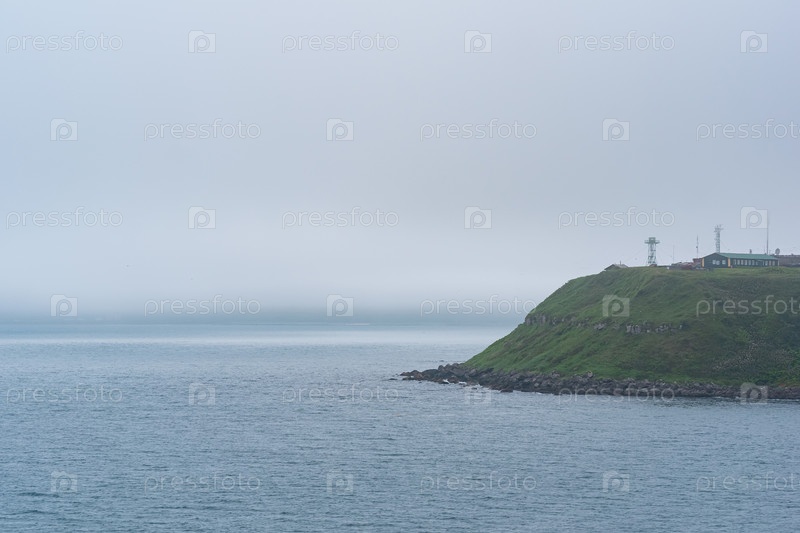 Туманный мыс с телекоммуникационной точкой в мрачном море