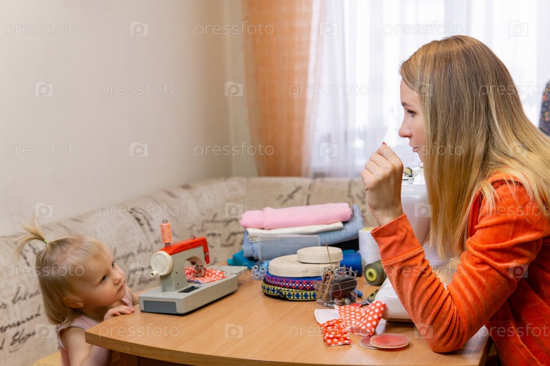 Маленькая дочка с игрушечной швейной машинкой играет со своей мамой-швеей