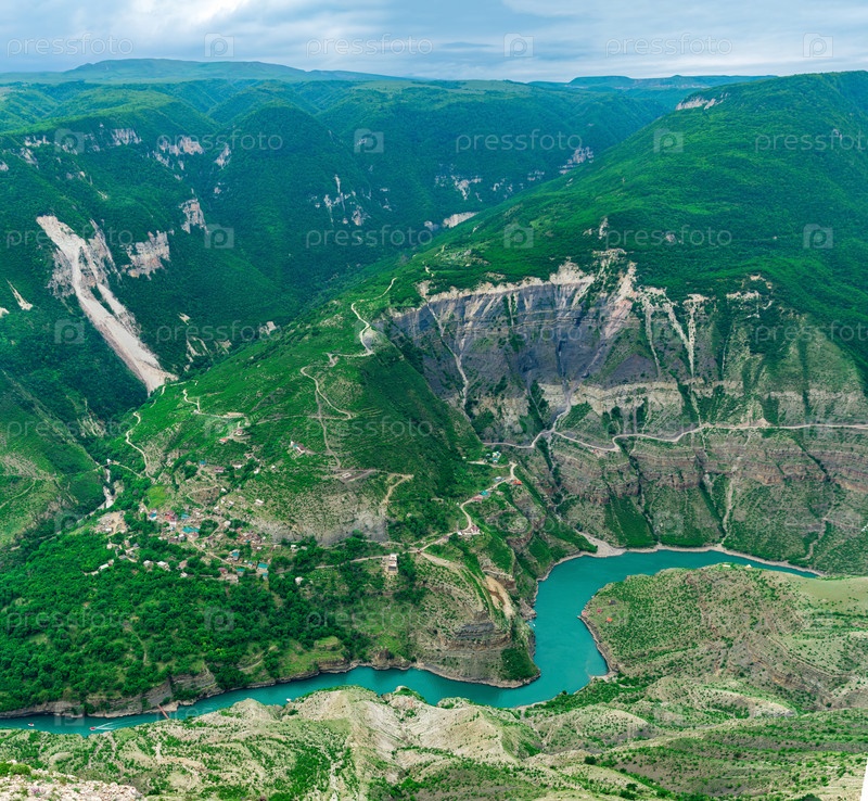 Вид с воздуха на Северный Кавказ, красивый пейзаж огромного каньона реки Сулак в Дагестане