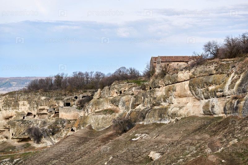 Вид на караимские кенасы на краю скалы в древнем пещерном городе Чуфут-Кале, Крым