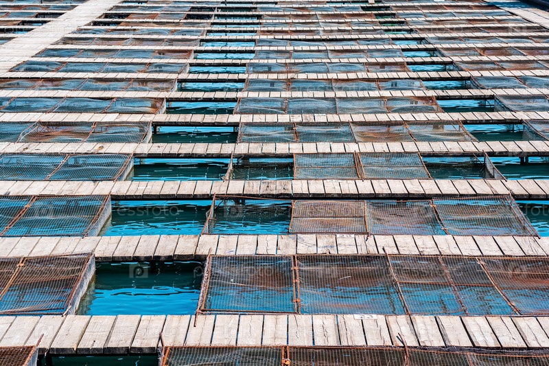 Установки для аквакультуры с рыбными клетками на рыбной ферме