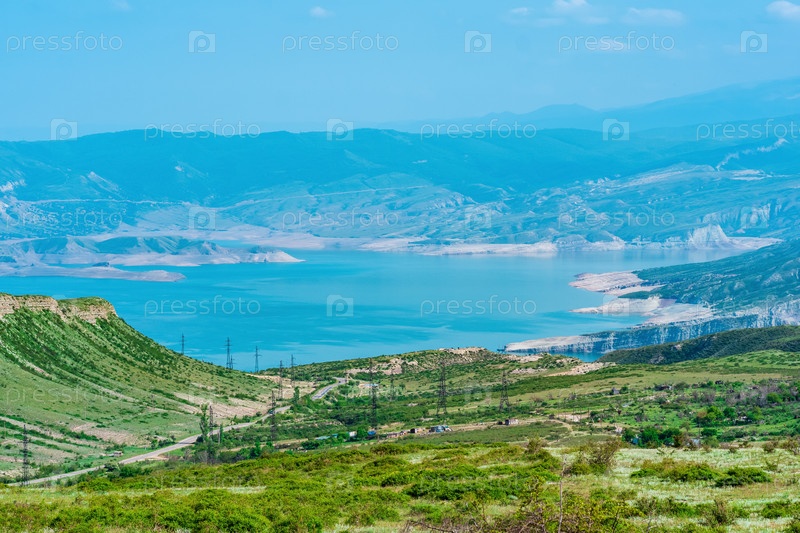 Вид на Чиркейское водохранилище среди гор и линии электропередач, идущие от ГЭС в долине