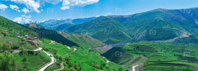 Горный пейзаж, панорама горного Дагестана с террасными полями, деревней и дорогами