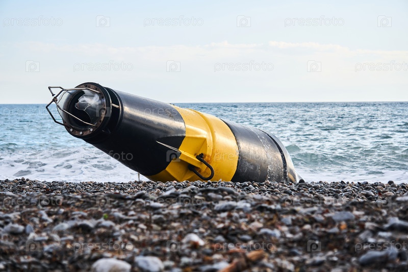 Поврежденный морской буй (знак кардинальной опасности), выброшенный на берег после шторма