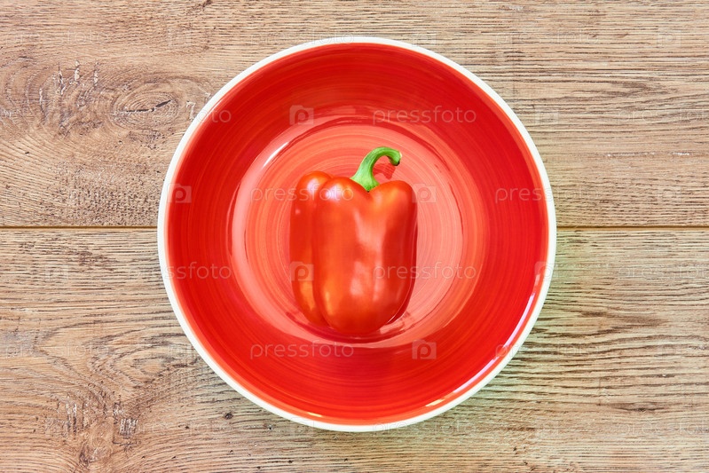 Красный стручок сладкого перца на красной тарелке на деревянном столе